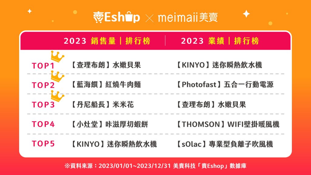 根據美賣站內2023全年的銷售數據顯示,「賣Eshop」全年開團數達8,000團,平均每天有21團的團購商品在發酵。其中商品品類銷售,食品類商品占大宗,而旅遊相關商品也呈現復甦趨勢,如行動電源則是次要銷售商品。